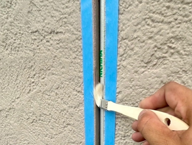 補修するシーリング材のラインを真っ直ぐに出すために、両サイドにマスキングテープを貼ってからプライマーを塗布します。