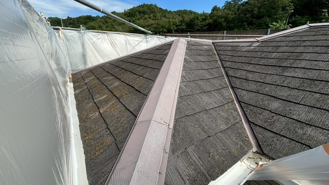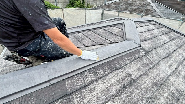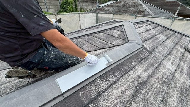 今回は、庇(ひさし)と瓦同士の境目にある棟板金を塗装しました。