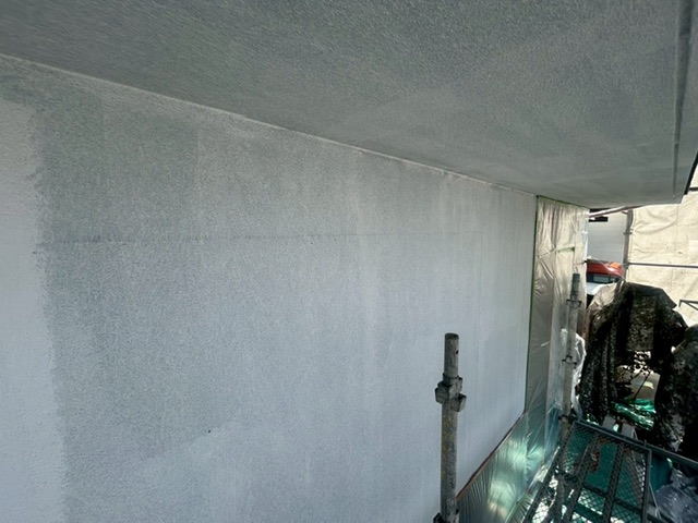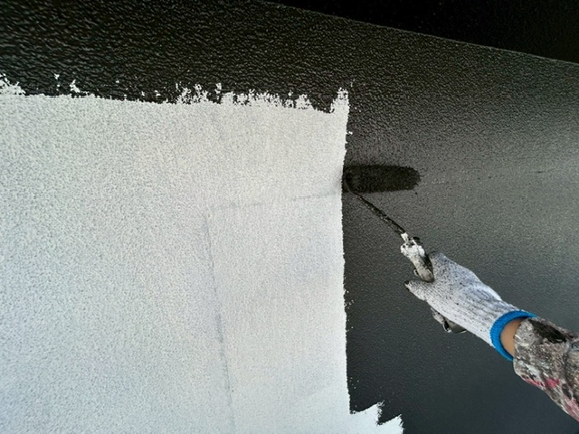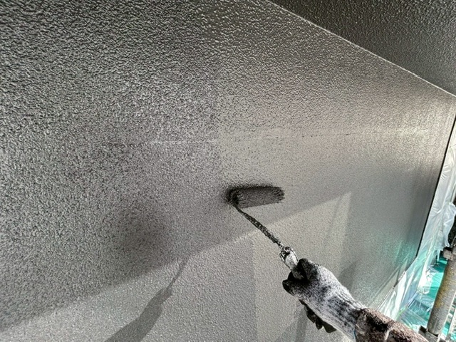 下地材によって白くなった外壁に濃いグレーの色が付いていきます。
