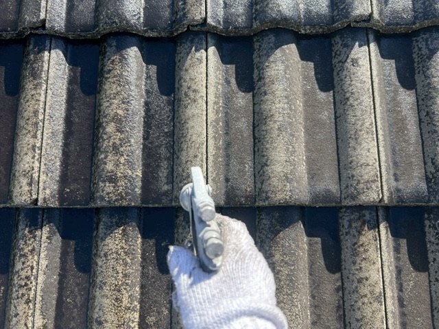 劣化した瓦がシーラーを吸収して、元の色より濃くなっているのが分かります。