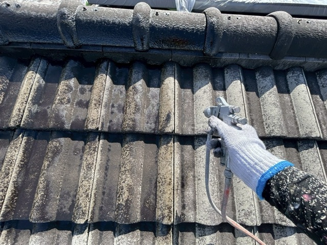 またモニエル瓦は表面の凹凸が激しいので、ローラーではなくエアレスで吹付をして塗装しました。