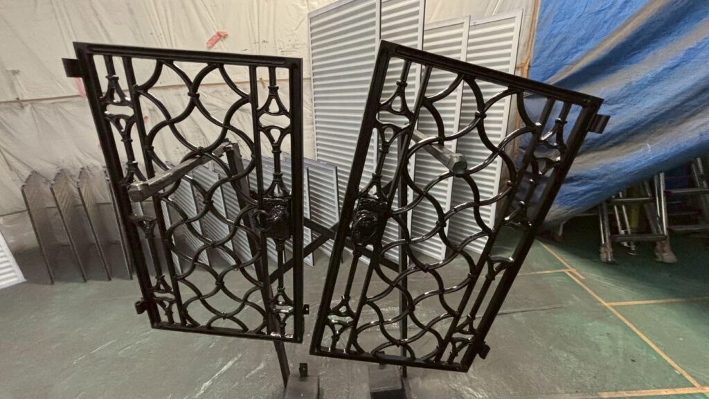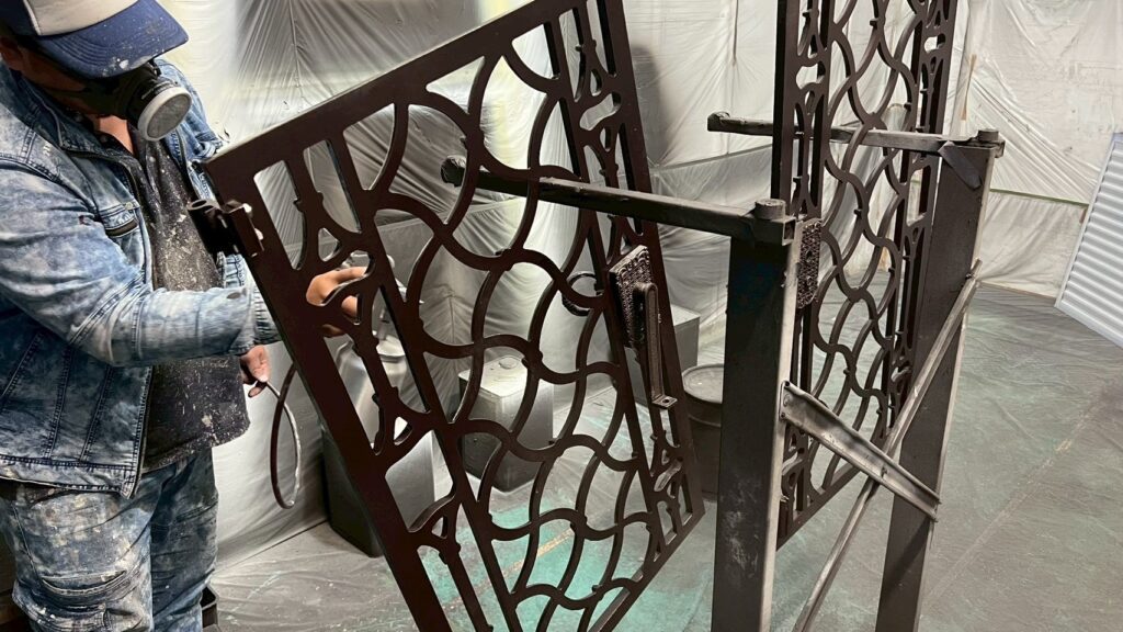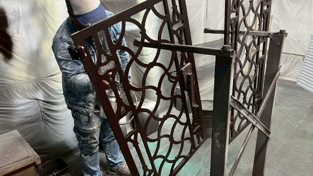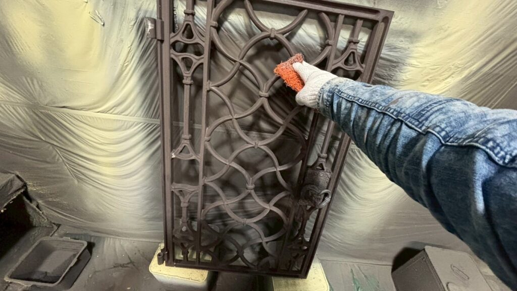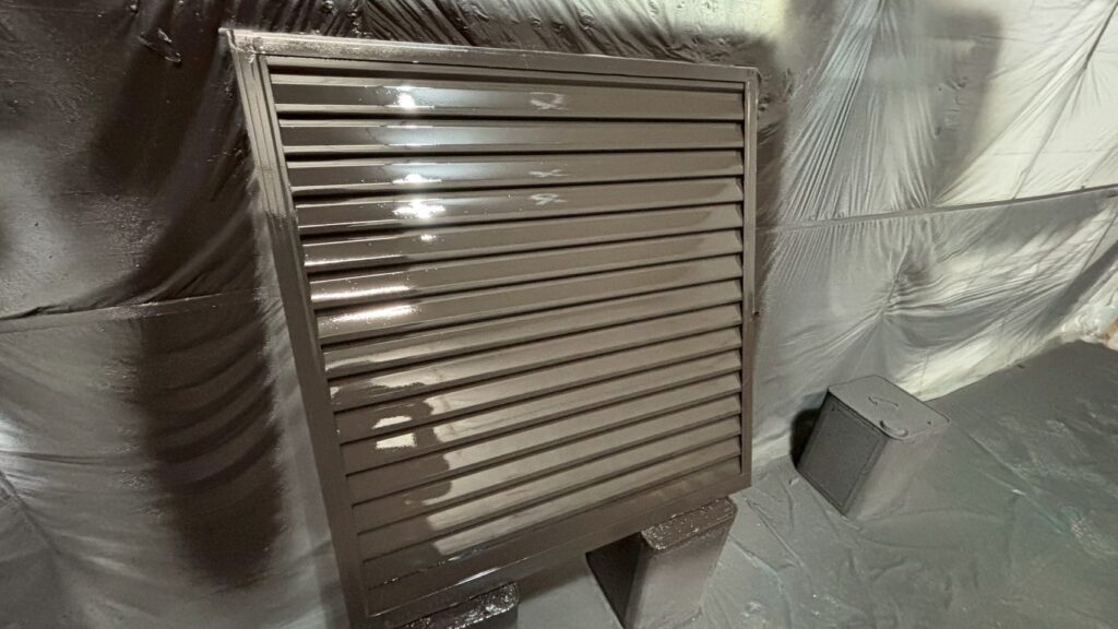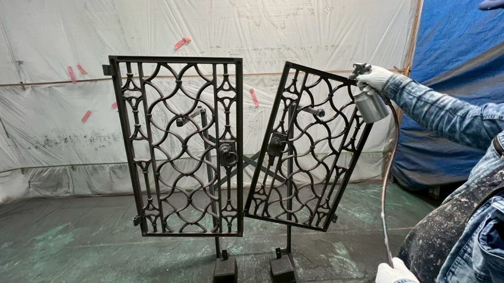 平面が少なく、ボコボコしている対象物のため、吹付の方が隙間に塗料が楽に入ってくれるためです。