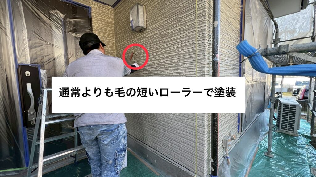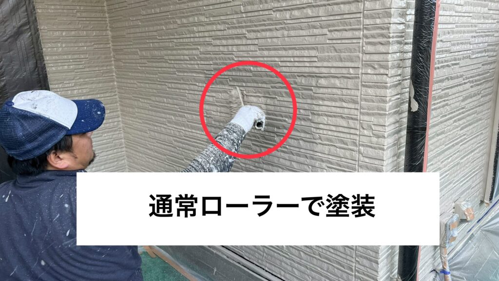 通常ローラーでは外壁の模様の中までしっかり塗料を入れ込まないといけない為、毛の長いローラーを使用して塗装をします。