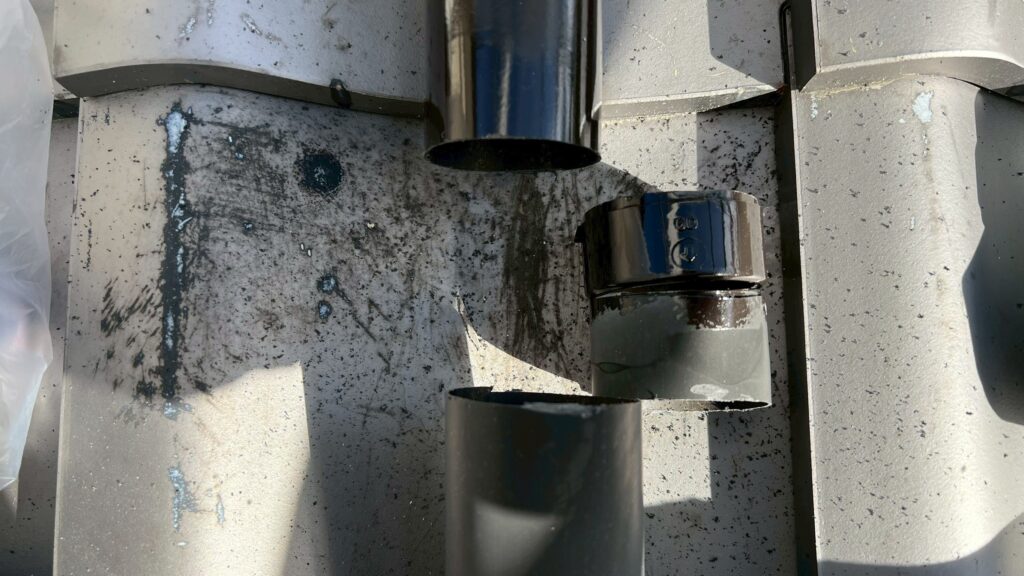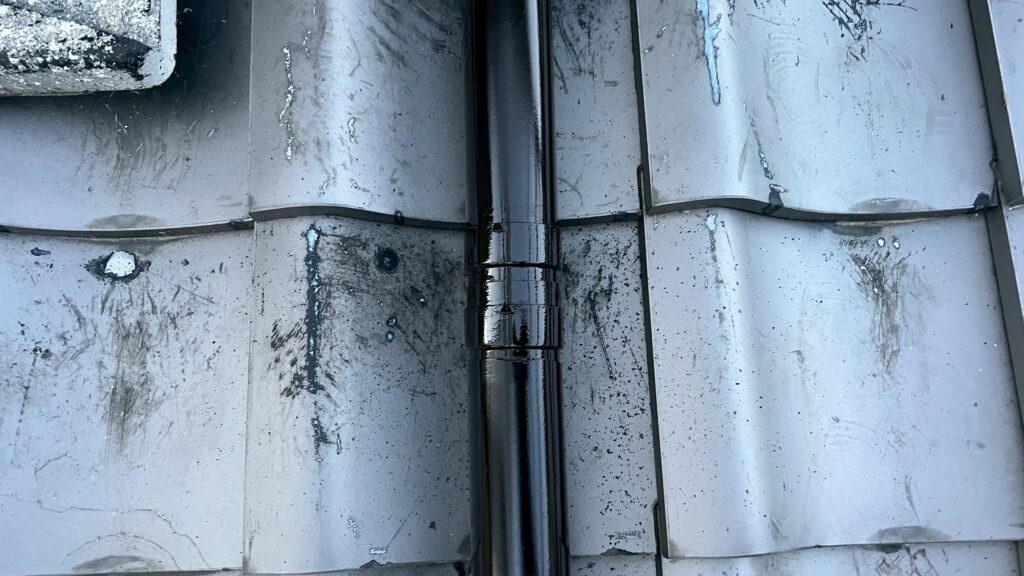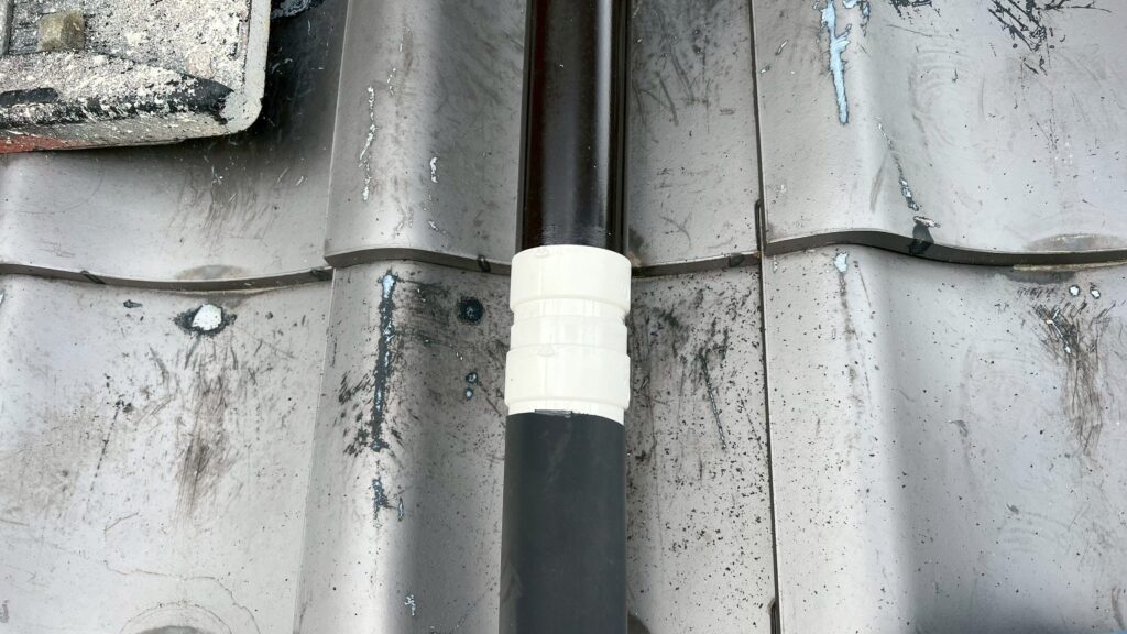 下屋根の上を通る樋が部分的に割れていたので、交換をしてから塗装しました
