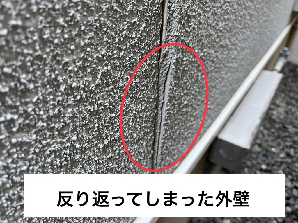 新築時は真っ直ぐだった外壁ですが継ぎ目の割れや防水性の劣化した外壁から湿気を吸収したことにより変形していました。