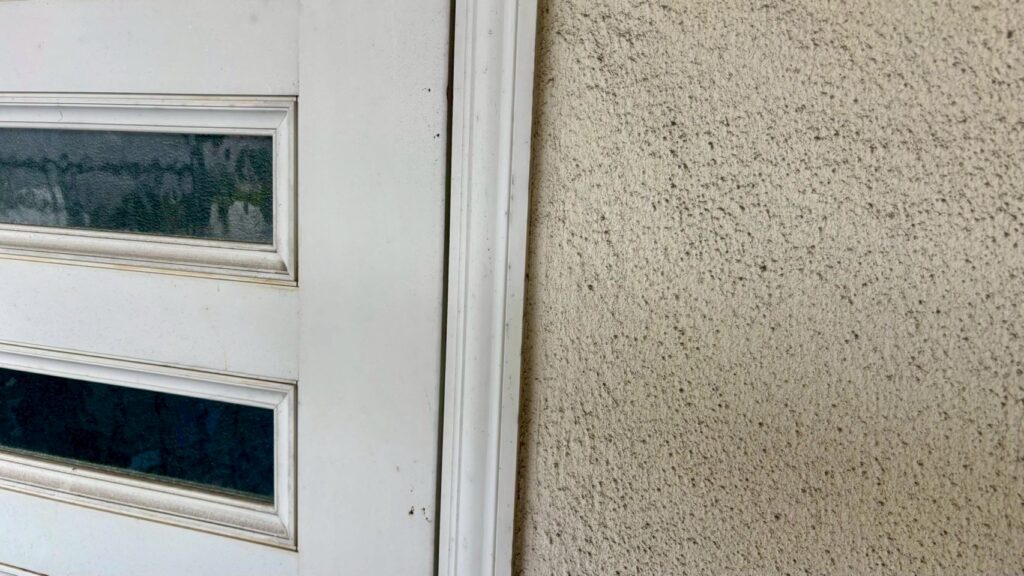 こちらのお家の外壁はモルタル壁という種類で表面にはリシンと言います砂のような塗料が新築事に吹付されています。