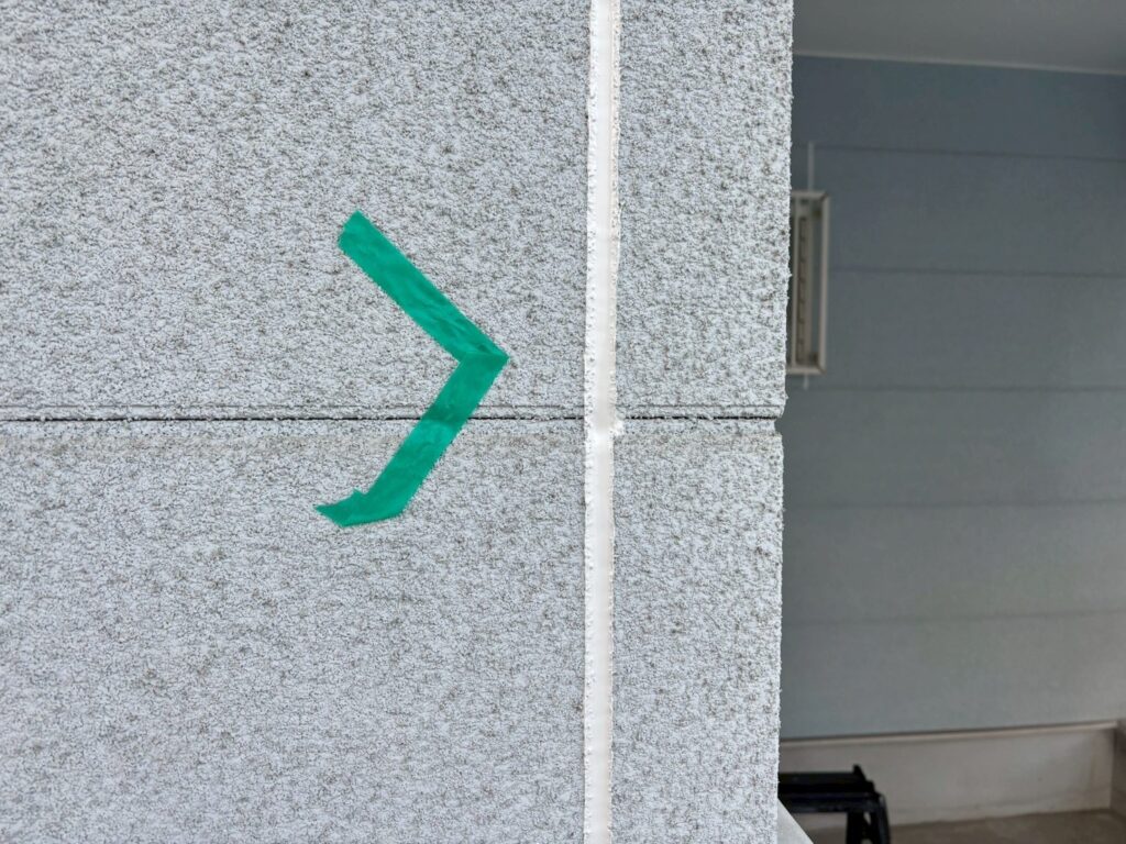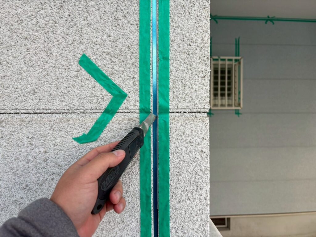 保守したシーリングを真っ直ぐにするためにマスキングテープを貼っていきます