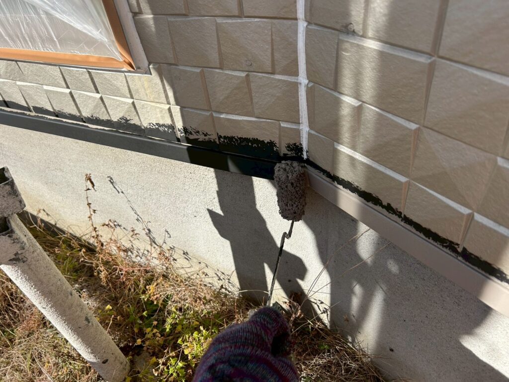 水切り・シャッターボックスは鉄なので先に黒く見える錆止めを塗装してから塗装をしています。