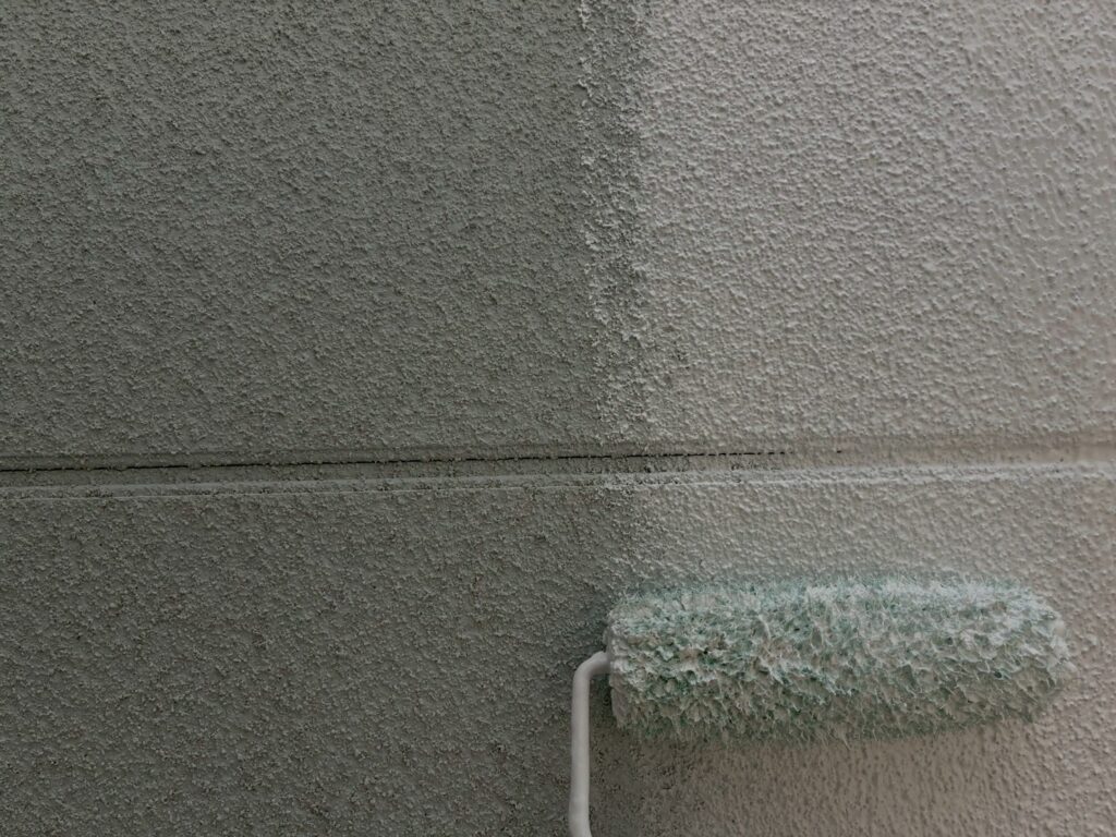 1回目の塗装は下地がリシンと言います砂の塗料でしたので、密着性を考慮してフィラーという白い塗料を塗装します。