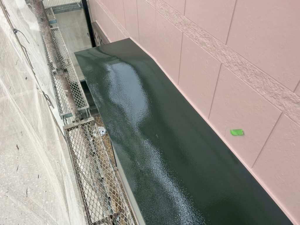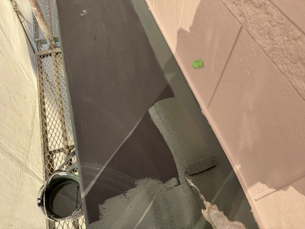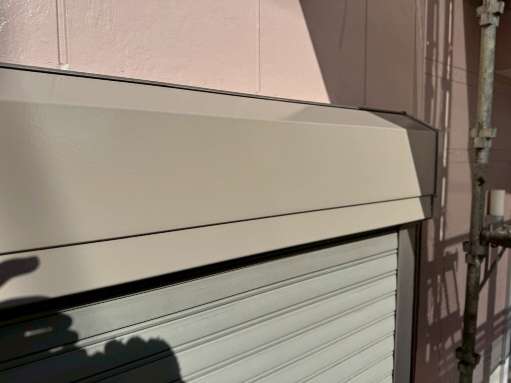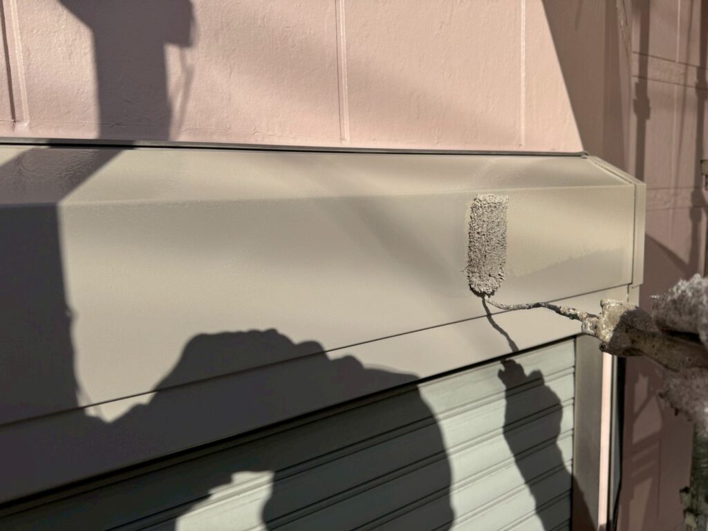 シャッターボックスや庇のような鉄部は外壁塗装前に錆止めの塗装をしているので、合計3回塗装で仕上げます。
