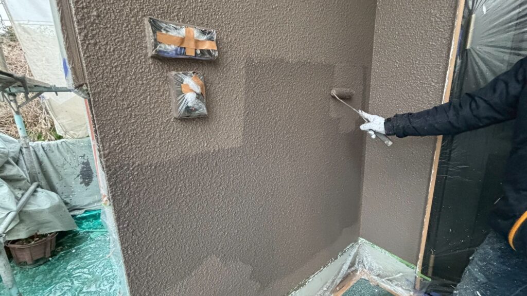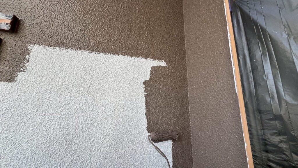 2回目の塗装で白くなった外壁に色が付いていきます。